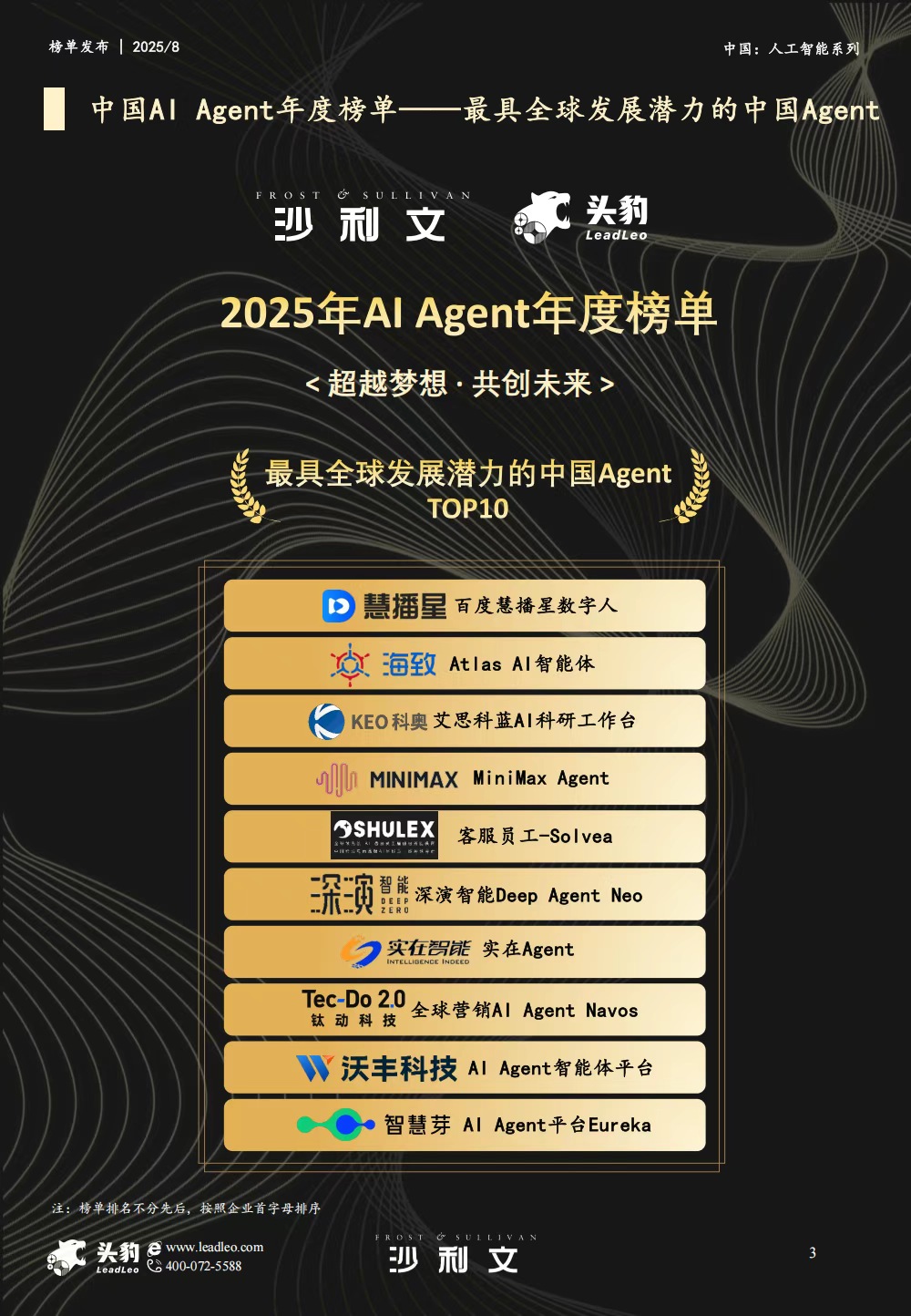 8月28日,全球知名咨询机构沙利文联合头豹研究院发布了《2025年中国AI Agent(智能体)最佳实践应用榜单》,凭借自主研发的 AI 智能体平台 Deep Agent Neo 的突出实力,人生就是博智能从 150 家参评企业、近 300 个产品 / 解决方案中脱颖而出,成功入选 “最具全球发展潜力的中国 Agent” TOP10 榜单,再度印证其在 AI Agent 领域的技术硬实力与全球化发展潜力。